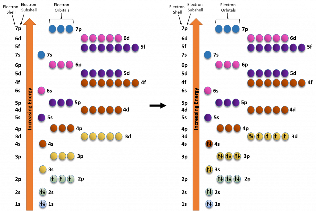 Understanding the electron configuration within an element is important for understanding the reactivity of the element. The modern theory of electron behavior is predicted by the field of quantum mechanics. The term quantum is defined as a discrete quantity or ‘packet’ of energy. Electrons in atoms can exist at different energy levels depending on how far away from the nucleus of that atom that they are positioned.  Electrons typically have higher energy, the farther away they are (on average) from the nucleus. Four quantum numbers (n, l, ml, and ms) are used to assign the position of an electron within at atom. The principle quantum number (n) refers to the electron shells and corresponds to each period or row on the periodic table. The orbital angular momentum quantum number (l) refers to the electron subshell classification which can be of the s, p, d, or f categories.  The magnetic quantum number (ml) refers to the electron orbitals, and the electronic spin number (ms) refers to the electron spin state of the electrons. Each orbital can house 2 electrons, each of which have an opposite spin. Each subshell can house a specific number of electron orbitals: s-subshells have one orbital and can house a total of 2 electrons, p-subshells have three obitals and can house a total of 6 electrons, d-subshells have five orbitals and can house a total of 10 electrons, and f-subshells have seven orbitals and can house a total of 14 electrons.