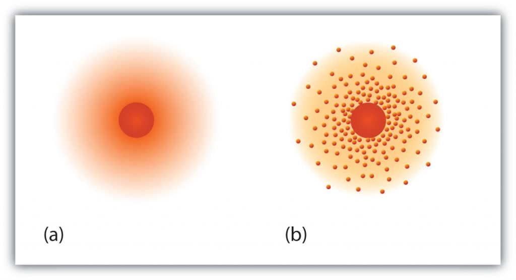 Fig 2.6 The path of the electron in a hydrogen atom. Electrons are not in discrete orbits like planets around the sun. Instead there is a probability that an electron may occupy a certain space within the electron cloud (a) The darker the color, the higher the probability that the hydrogen’s one electron will be at that point at any given time. (b) Similarly, the more crowded the dots, the higher the probability that hydrogen’s one electron will be at that point. In both diagrams, the nucleus is in the center of the diagram.