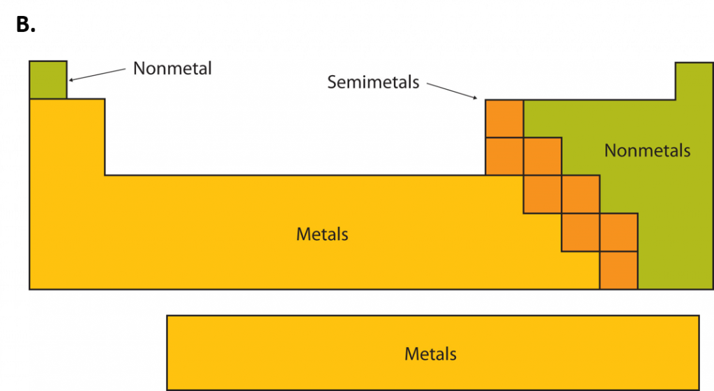 Figure 2.2: Periodic Table of the Elements. All of the known chemical elements are arranged in the format of a table. The table has been set up in such a way that the characteristics of each different element can be predicted by their position on the table. (A) On this rendition of the periodic table, you can see that the pink elements on the lefthand side of the table are the metals, while the blue elements on the right are the non-metals (Hydrogen is the only exception to this rule and will be explained in the subsequent sections). The metalloids (also termed semi-metals) occur in a stairstep pattern between the metals and nonmetals and are represented in this diagram by the green elements. (B) Shows the positions of the metals, nonmetals and metalloids on the periodic table. During this chapter, you will learn more about these unique characteristics, called periodic trends.