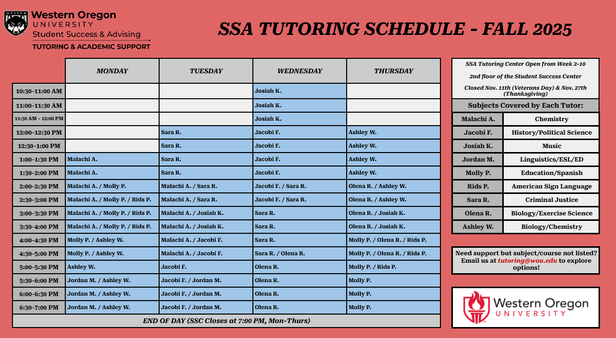 SSA Tutoring is open during the Fall, Winter, and Spring terms, Weeks 2-10, and covers all course subjects aside from Math, Computer Science, and Writing. Tutoring dedicated to those subjects at WOU can be found here: wou.edu/freetutoring/