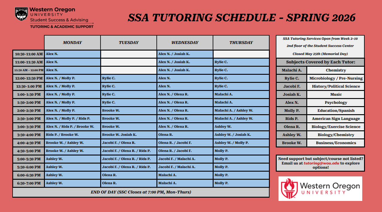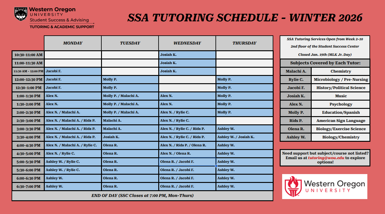 SSA Tutoring is open during the Fall, Winter, and Spring terms, Weeks 2-10, and covers all course subjects aside from Math, Computer Science, and Writing. Tutoring dedicated to those subjects at WOU can be found here: