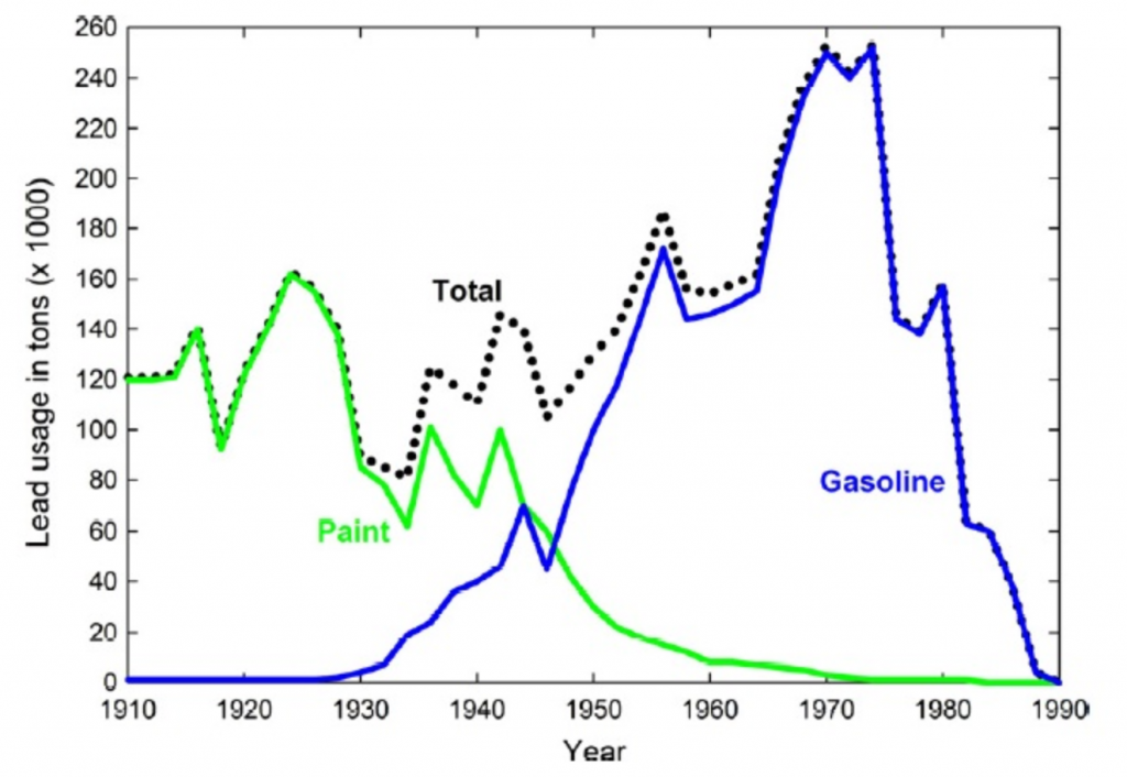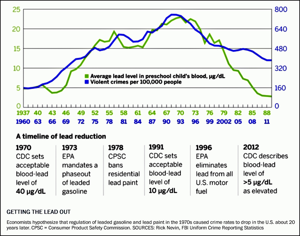 A number of studies over the last decade have shown a strong correlation between preschool blood lead levels and subsequent crime rates, especially violent crimes occurring 20 years later (Figure 7.16).