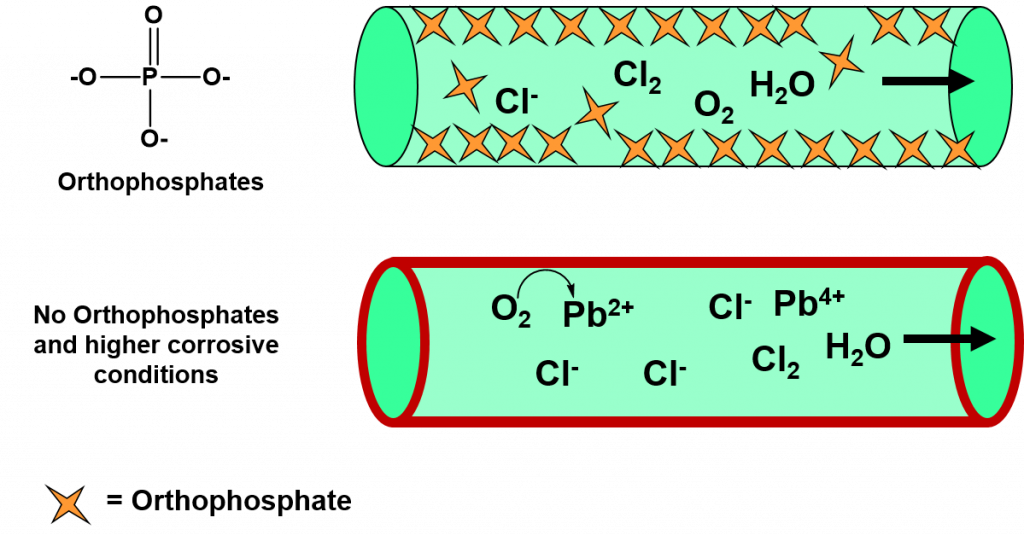 Thus, in an attempt to reduce the formation of trihalomethane by-products, the City of Flint began adding more FeCl3 to the water to help remove the additional organic materials in this water source. However, they failed to add any corrosion control molecules, such as orthophosphate. Many water treatment facilities use low concentrations of orthophosphates to interact with lead in pipes and form an insoluble lead phosphate lining that does not leach into the water supply (Figure 7.18). The lack of corrosion control by the City of Flint combined with the increased amounts of FeCl3, caused the amount of Cl– ions present to increase dramatically. The result was an overall increase in the corrosion potential, as measured by a chloride to sulfate mass ratio, from 0.45 for the Detroit Water Supply to 1.60 for the new Flint River Water Supply. With this corrosion potential, oxygen molecules within the water began to oxidize and release soluble forms of lead into the water system (Figure 7.18). In addition to oxidized lead by-products, oxidized forms of iron were also released causing more discoloration of the water.