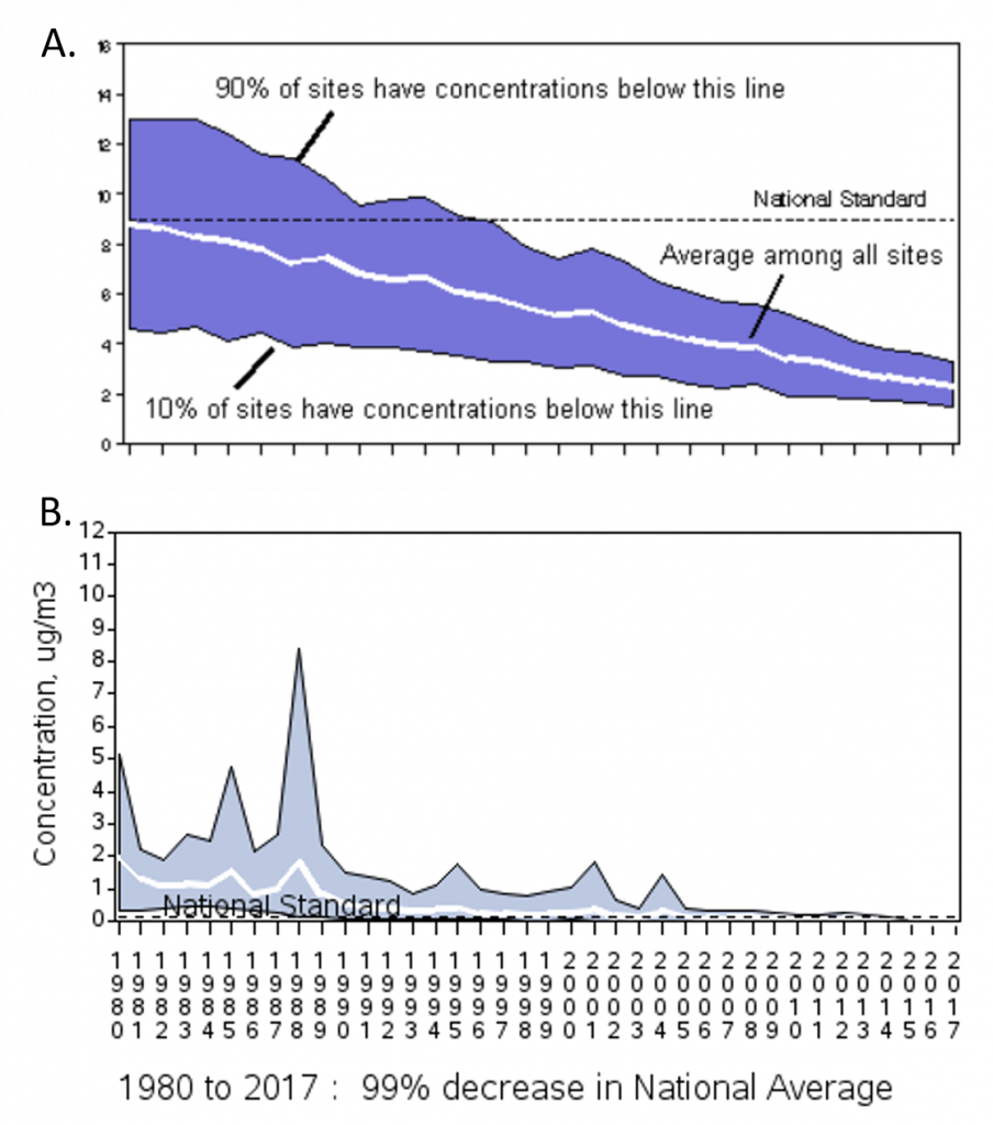 7.14 Decline in average blood lead levels in U.S. children and in total led used per year in gasoline for years 1974-1992 (Adapted from U.S.EPA 1999).