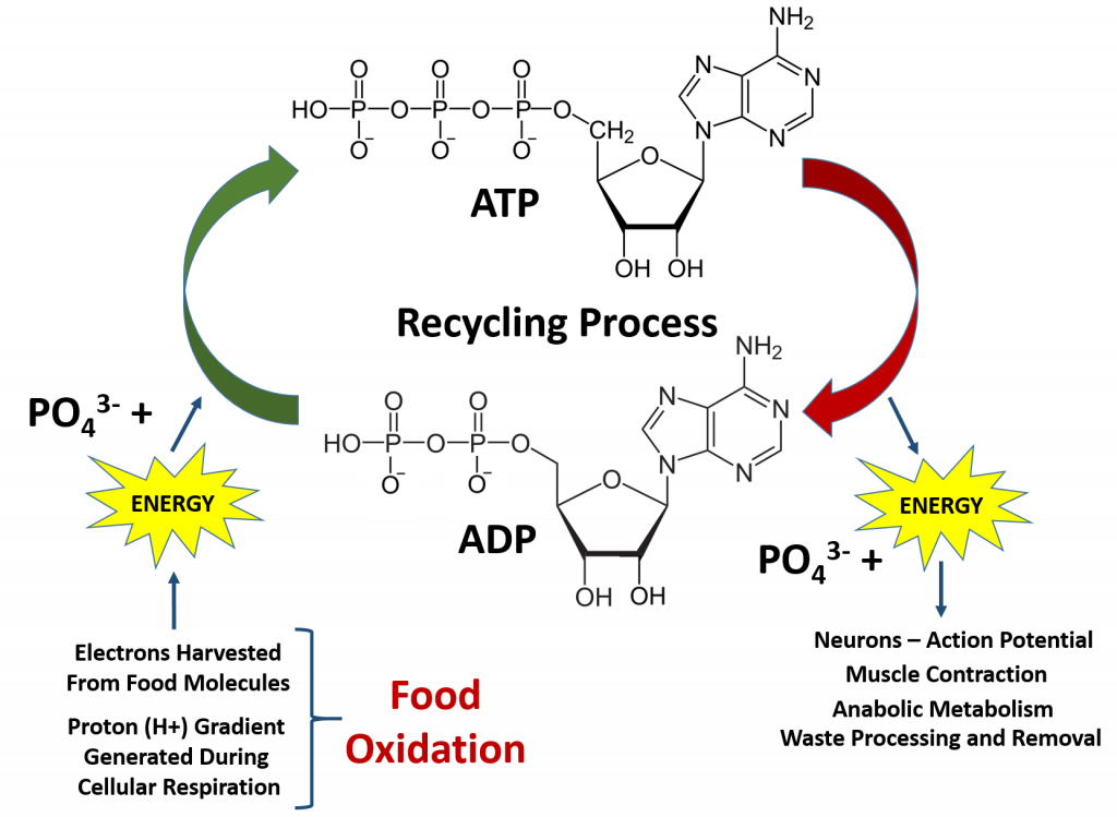 ATP is the major energy currency within the cell. It is present within the human body at very low concentrations (~ 250 g) However, the average human will use their weight (50 – 75 kg) in ATP every single day! Thus, ATP must continually be recycled within the human body alternating between ADP and ATP. ATP is recycled in the mitochondria in a process called oxidative phosphorylation. In this process, energy is taken from food molecules through oxidation. The electrons that are pulled from the food molecules can be used as an energy source to make ATP by phosphorylating ADP. Specifically, the electrons from food are used in the electron transport chain to create a proton (H+) gradient in the intermembrane space of the mitochondria. The proton gradient, flows like a river through the ATP synthase protein channel and drives the production of ATP.