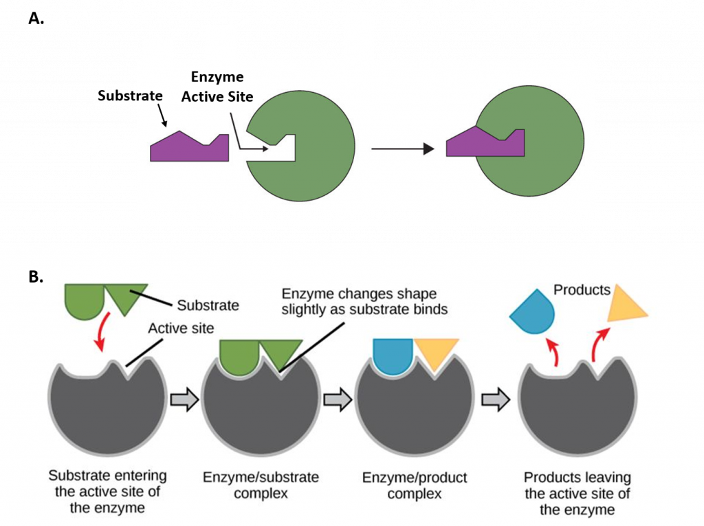 Figure 7.2 Mechanisms of Enzyme-Substrate Binding. (A) In the Lock and Key Model, substrates fit into the active site of the enzyme with no further modifications to the enzyme shape required. (B) In the Induced Fit Model, substrate interaction with the enzyme causes the shape of the enzyme to change to better fit the substrate and mediate the chemical reaction.