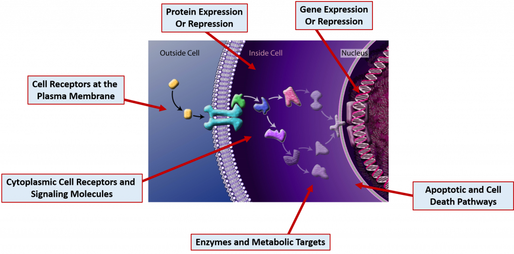 This section will focus primarily on common drug MOAs. Drugs can act on molecular targets from any of the major macromolecule groups or from mixtures of the different groups. DNA and RNA often form complexes with proteins and many cellular receptors are modified with carbohydrate structures forming both glycoproteins and glycolipids. Drugs can have effects through the binding of molecular targets are very specified locations in the cell as depicted in Figure 7.18