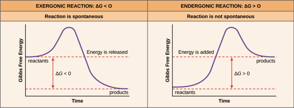 For a chemical reaction to be spontaneous, the reaction needs to be exergonic, or releasing energy as a product of the reaction . If a reaction requires energy input, it is said to be endergonic and will NOT occur spontaneously. Spontaneity can be measured using the Change in Gibbs Free Energy (ΔG). This can also be represented graphically. If ΔG is negative, energy will be released and the reaction is spontaneous, whereas if ΔG is positive, the reaction requires energy input and is NOT spontaneous. If ΔG = 0, the reaction is at equilibrium and there is no net movement in either direction.