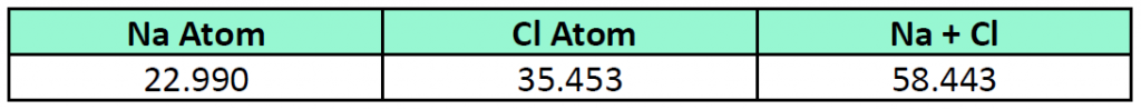 A molecule of NaCl contains 1 Na+ and 1 Cl-. Thus, we can calculate the molar mass of this compound by adding together the atomic masses of sodium and chlorine, as found on the periodic table (Figure 4.1).