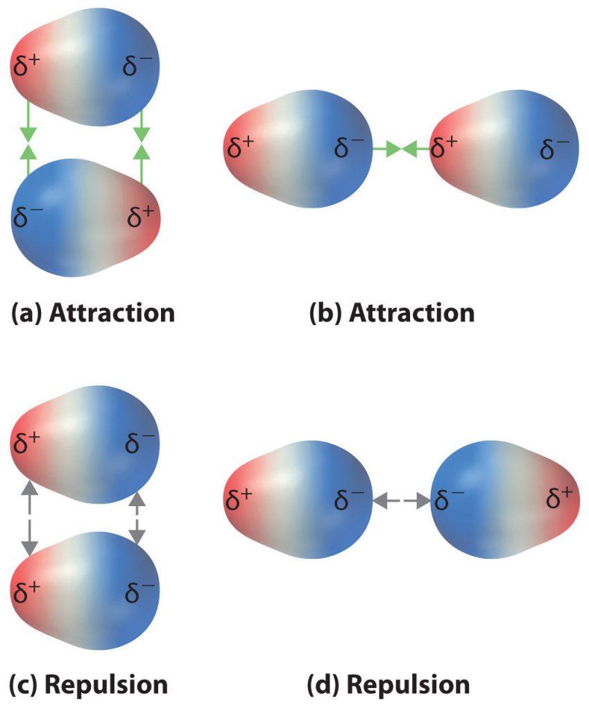 Figure 4.11 Attractive and Repulsive Dipole-Dipole Interactions. (a and b) Molecular orientations in which the positive end of one dipole (δ+) is near the negative end of another (δ−) (and vice versa) produce attractive interactions. (c and d) Molecular orientations that juxtapose the positive or negative ends of the dipoles on adjacent molecules produce repulsive interactions.
