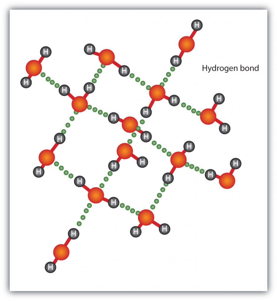Figure 4.13 Hydrogen Bonding between Water Molecules. The presence of hydrogen bonding in molecules like water can have a large impact on the physical properties of a substance.