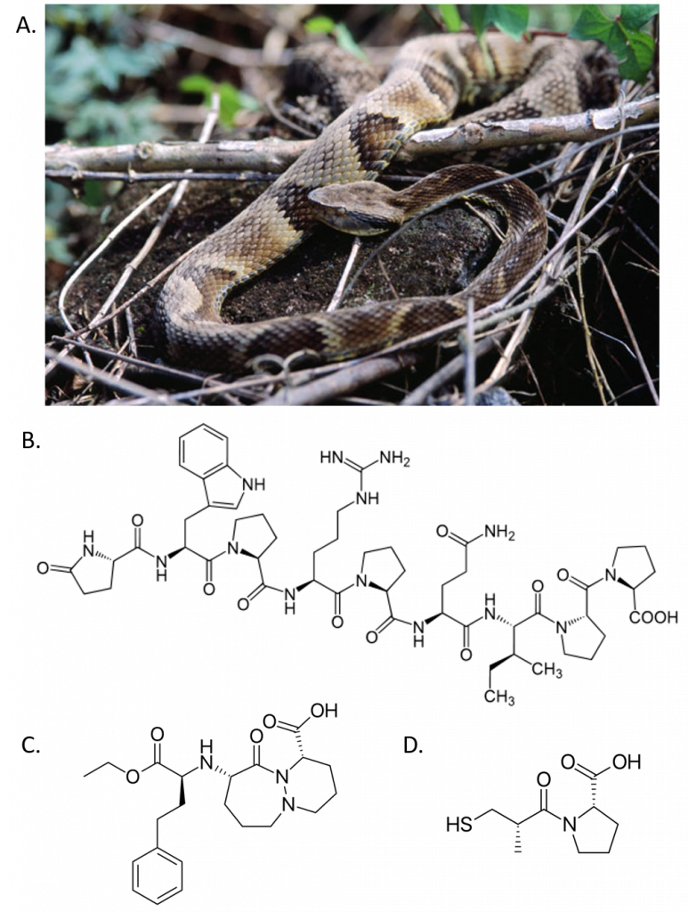 Photo of Bothrops jararaca by: Felipe Süssekind , Structure of Teprotide by: Yikrazuul, Structure of Cilazapril by: Vaccinationist, and Structure of Captorpril by: Vaccinationist.