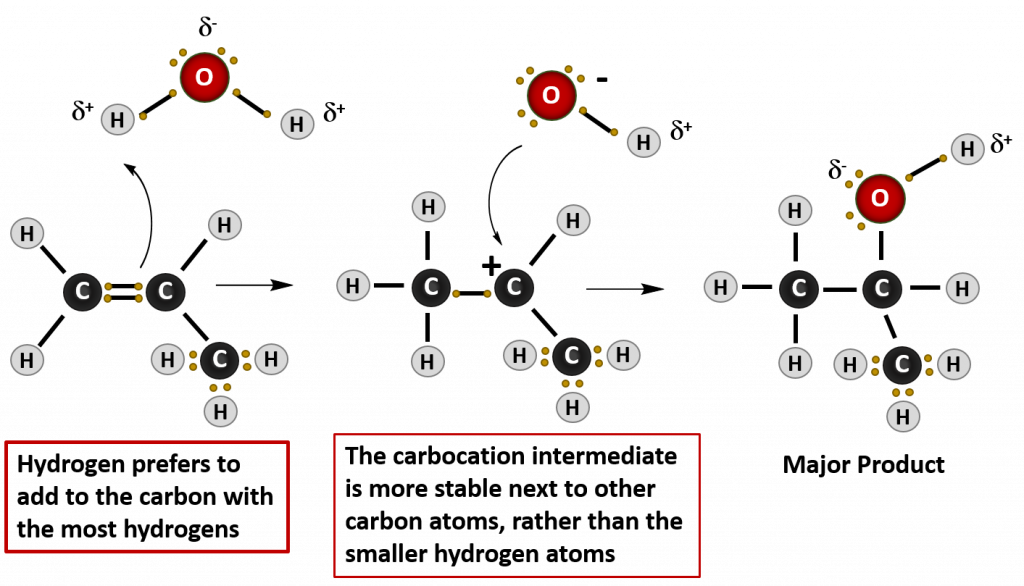 In these types of reactions, Markovnikov’s Rule can be used to predict which product will be the major product. Markovnikov’s Rule states that in addition reactions with HX (where X is a halogen or the OH group from water), the H always attaches to the carbon that already has the most hydrogens, and the X attaches the carbon with the fewer hydrogen atoms. This occurs because the carbocation intermediate that forms as the reaction proceeds is more stable when it is bonded to other carbon atoms, than when it is bonded with hydrogen atoms, as seen in the example below: