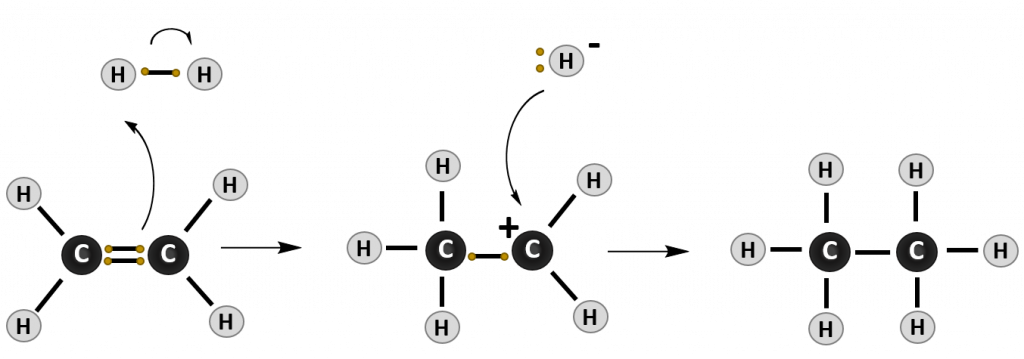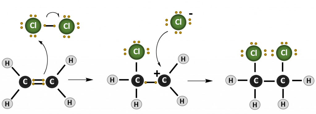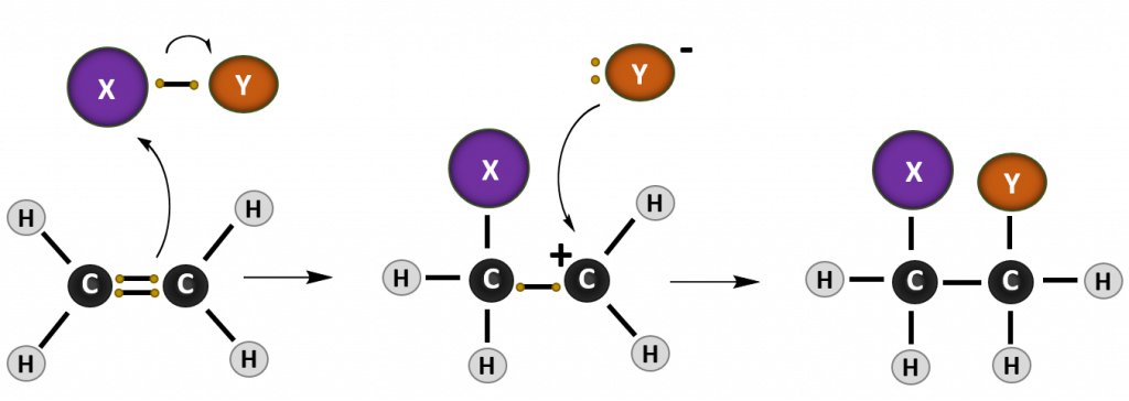 Figure 8.15. Reaction mechanism of a generic addition reaction. In this reaction, an electron from the carbon-carbon double bond of the alkene attacks an incoming molecule (XY) causing the breakage of the carbon-carbon double bond (lefthand diagram) and formation of a new bond between one of the alkene carbons and molecule X. The original electron from X that was participating in the shared bond with Y, is donated to Y causing the breakage of the X-Y bond. In the intermediate state (middle diagram), the alkene is carrying a positively charged carbon ion, called a carbocation, and Y is in a negatively charged anion state. The negative anion is attracted to the positively charged carbocation and donates the two electrons to form the C-Y bond and complete the product of the addition reaction (righthand diagram).