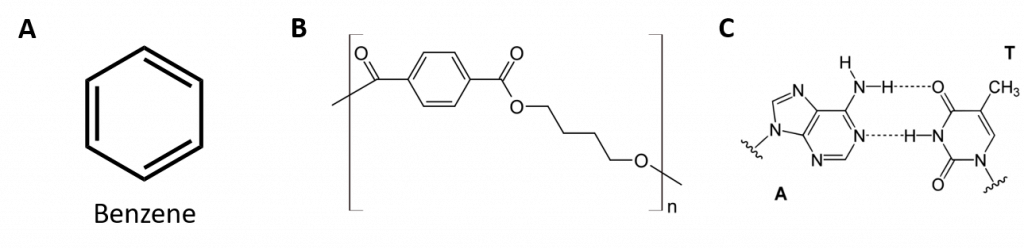 Figure 8.2: Aromatic Hydrocarbons. Aromatic hydrocarbons contain the 6-membered benzene ring structure (A) that is characterized by alternating double bonds. Ultradur, PBT is a plastic polymer that contains an aromatic functional group. The repeating monomer of Ultradur is shown in (B). Ultradur can be found in showerheads, toothbrush bristles, plastic housing for fiber-optics cables, and in automobile exterior and interior components. Biologically important molecules, such as deoxyribonucleic acid, DNA (C) also contain an aromatic ring structures.