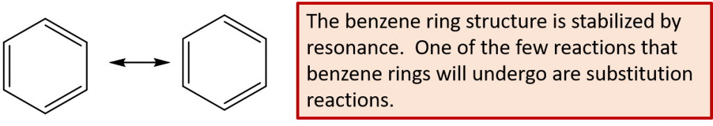 Thus, the overall structure is very stable compared to other alkenes and benzene rings do not readily undergo addition reactions. They behave more similarly to alkane structure and lack chemical reactivity. One of the few types of reactions that a benzene ring will undergo is a substitution reaction. Recall from Chapter 7 that in substitution reactions an atom or group of atoms is replaced by another atom or group of atoms. Halogenation is a common substitution reaction that occurs with benzene ring structures. In the diagram below, notice that the hydgrogen atom is substituted by one of the bromine atoms.