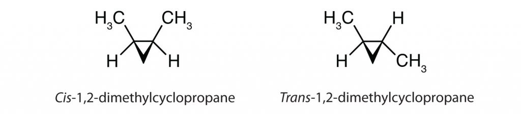 Cis-trans isomers (or geometric isomers) are characterized by molecules that differ only in their configuration around a rigid part of the structure, such as a carbon–to-carbon double bond or a ring. The molecule having two identical (or closely related) atoms or groups on the same side is the cis isomer; the one having the two groups on opposite sides is the trans isomer.