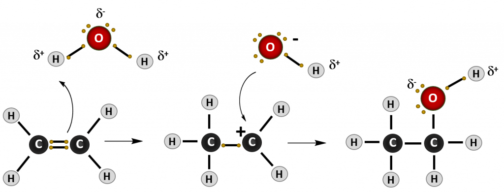 Just like when your are feeling thirsty, the terms hydration and dehydration refer to water. Hydration means the addition of water to a molecule, just like when you feel fully hydrated or full of water, while dehydration means the removal or elimination of water, just as when you are feeling dehydrated and need some water to drink. Similar to the hydrohalogenation reaction above, water is also a polar molecule. In this case, the water is split into two groups to be added across the double bond of the alkene. It is split into the H- and the -OH components. Similar to the hydrohalogenation reaction, the hydrogen adds first, as it carries the partial positive charge. the OH group forms the negative anion intermediate and is then added to the carbocation to form the final product, which is an alcohol.