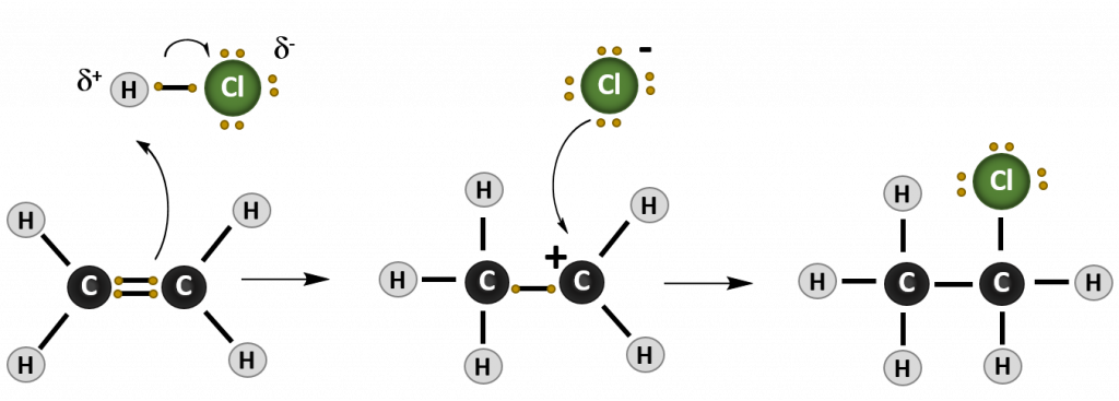 In Hydrohalogenation, alkenes react with molecules that contain one hydrogen and one halogen. Hence the name Hydro–Halogen-ation. HCl and HBr are common hydrohalogens seen in this reaction type. In hydrohalogenation, the hydrohalogen is a polar molecule, unlike the nonpolar molecules observed in the halogenation and hydrogenation reactions. In the case of the hydrohalogen, the end of the molecule containing hydrogen is partially positive, while the end of the molecule containing the halogen is partially negative. Thus, when the negatively charged electron from the alkene double bond attacks the hydrohalogen, it will preferentially attack the hydrogen side of the molecule, since the electron will be attracted to the partial positive charge. The halogen will then form the negatively charged anion observed in the intermediate structure and attach second during the addition reaction. The final product is a haloalkane.