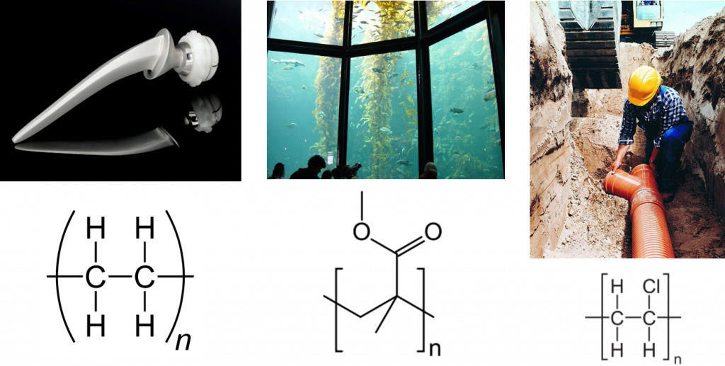 Figure 8.1 Common polymers made using alkene building blocks. Upper left, a stainless steel and ultra high molecular weight polyethylene hip replacement. The polyethylene repeating unit is shown in the lower left. Upper middle, shatterproof acrylic plexiglas used to build a large indoor aquarium. The methylacrylate repeating unit is shown in the lower middle. Upper right, common PCV piping used as material being used for sewage and drains. The polyvinylchloride repeating unit is shown in the lower left.