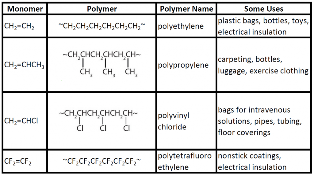 Some common addition polymers are listed in Table 8.2. Note that all the monomers have carbon-to-carbon double bonds. Many polymers are mundane (e.g., plastic bags, food wrap, toys, and tableware), but there are also polymers that conduct electricity, have amazing adhesive properties, or are stronger than steel but much lighter in weight.