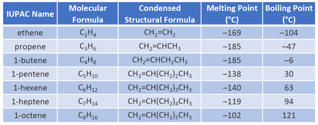 Some representative alkenes—their names, structures, and physical properties—are given in Table 8.1.