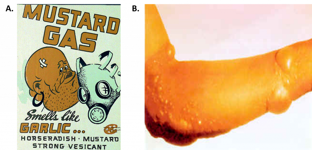 Figure 10.1 Use of Mustard Gas During World Wars I and II. A. US Army World War II Gas Identification Poster, ca. 1941–1945. B. Blisters on a human arm created by exposure to mustard gas.