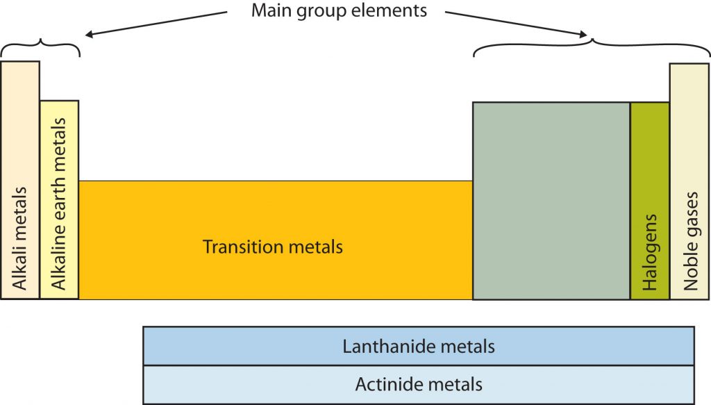 Fig 2.11. Special Names for Sections of the Periodic Table. Some sections of the periodic table have special names. For example, the elements lithium, sodium, potassium, rubidium, cesium, and francium are collectively known as alkali metals. Note that the main group elements do not include the transition metals.