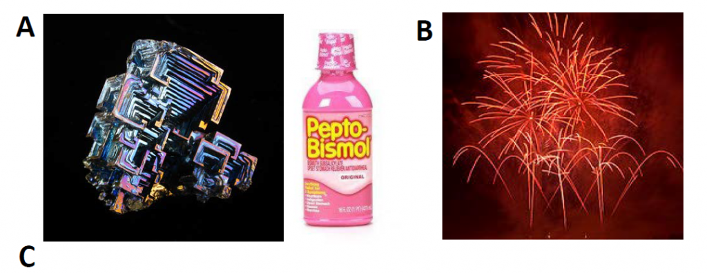 Figure 2.1: Elements. Some examples of pure elements include (A) Bismuth, Bi, a heavy metal is used as a replacement for lead and in some medicines, like pepto-bismol, the antidiarrheal and (B) Strontium, Sr, a major component in fireworks. (C) All of the elements that have been discovered are represented on the Periodic Table of Elements, which provides an elegant mechanism for not only displaying the elements, but describing many of their characteristics.
