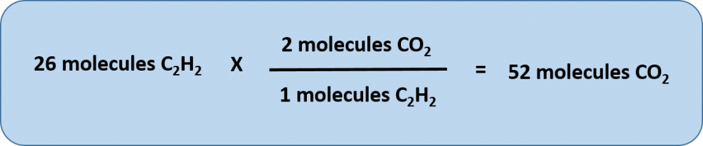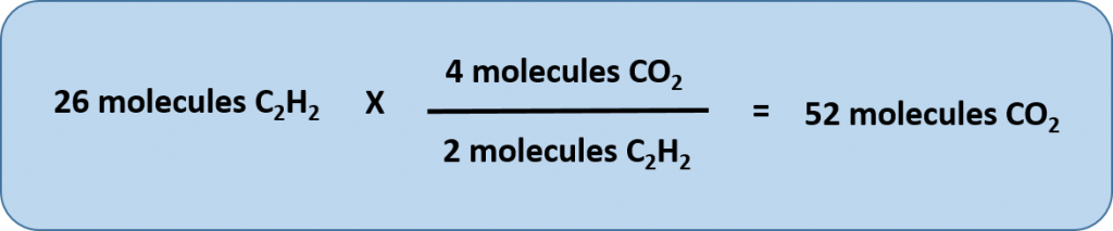 Thus, 52 molecules of CO2 are formed when we start with 26 molecules of C2H2. Note that with this conversion factor, that we could have simplified our conversion factor prior to completing the multiplication and division steps, as follows: