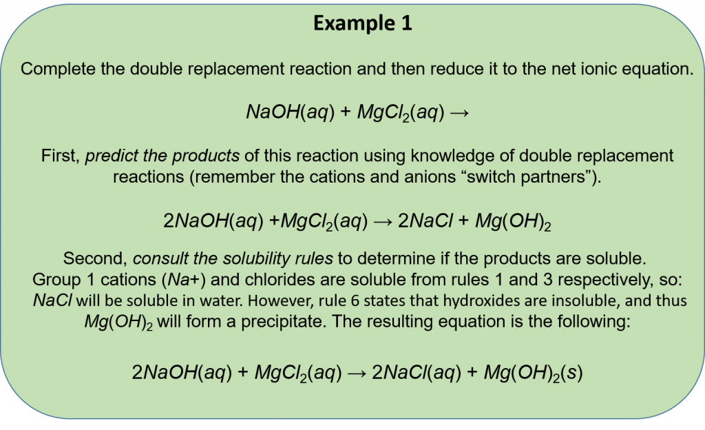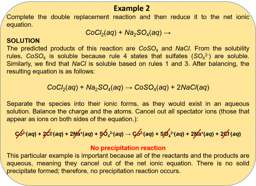 If the rules state that an ion is soluble, then it remains in its aqueous ion form. If an ion is insoluble based on the solubility rules, then it forms a solid with an ion from the other reactant. If all the ions in a reaction are shown to be soluble, then no precipitation reaction occurs.