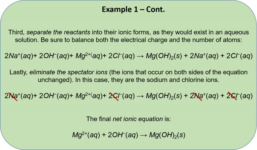 In the equation above, A+and D– ions are present on both sides of the equation. These are called spectator ions because they remain unchanged throughout the reaction. Since they go through the equation unchanged, they can be eliminated to show the net ionic equation: