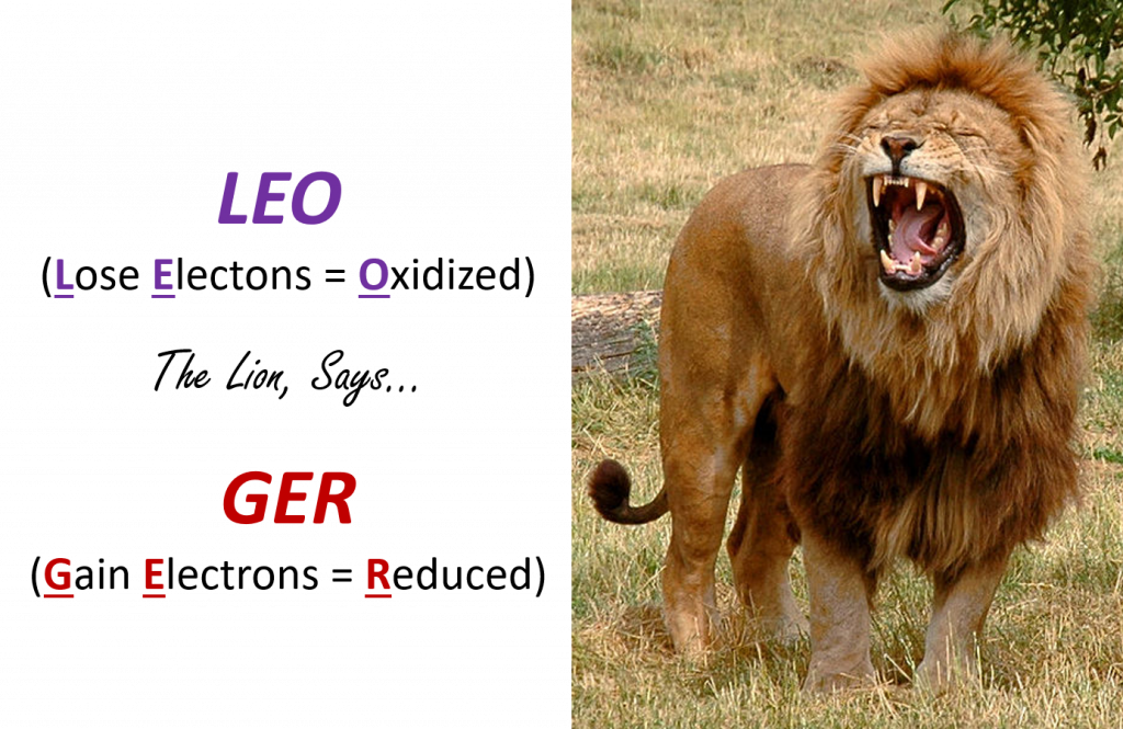 As shown in figure XX, an easy mnemonic for helping you remember which member gains electrons and which member loses electrons is ‘LEO the lion says GER’, where LEO stands for Lose Electrons = Oxidized and GER stands for Gain Electrons = Reduced.