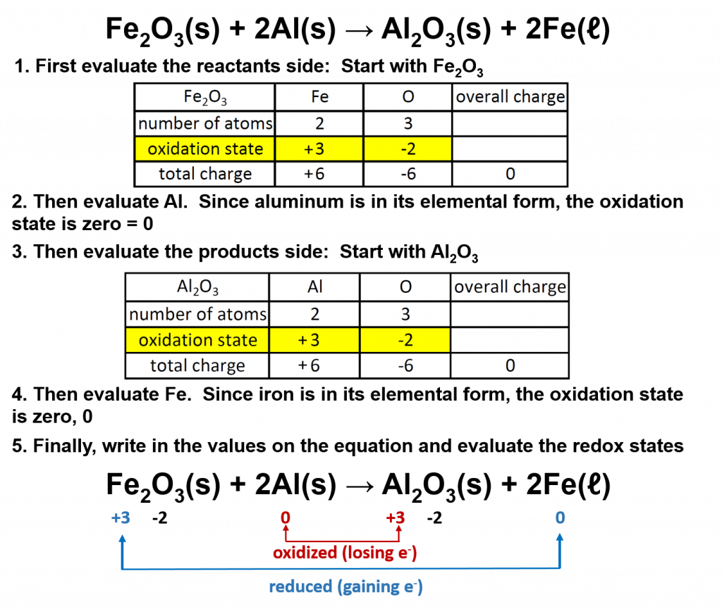 Overall in this reaction, the aluminum is oxidized to aluminum oxide, and the iron in the iron III oxide is reduced to elemental iron. Notice that there is no change to the oxidation state of oxygen.