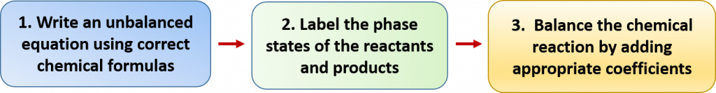 To write proper chemical reactions, it is first necessary to write the correct chemical formulas. As you have learned in Chapters 3 and 4, both ionic and covalent compounds combine to either donate/accept electrons or share electrons in ways that enable atoms to reach a stable state, most often following the octet rule. This should be the first consideration when writing a chemical reaction.The second consideration should be the states of the matter involved in the chemical reaction. Label each as a solid (s), a liquid (ℓ), a gas (g), or an aqueous solution (aq). Once the correct chemical formulas have been established, proper chemical equations should then be balanced. Writing balanced reactions is a chemist’s way of acknowledging the law of conservation of matter.
