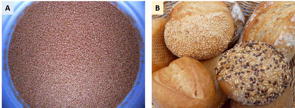 Figure 5.1 Yeast is used in many food processing applications. In bread making, the yeast, Saccharomyces cerevisiae, is often sold as a granulated dry form (A). It is used to create leavened bread (B).