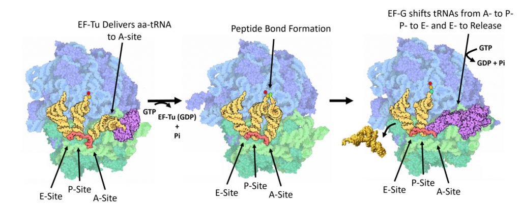 Figure 11.31 One Cycle of Elongation. (Left) During one round of amino acid elongation on a nascent peptide, the EF-Tu protein binds with the cognate aa-tRNA molecule and shuttles it to the A-site of the ribosome. GTP hydrolysis by EF-Tu leads to the hybridization of the anticodon of the tRNA with the codon of the mRNA and causes the dissoication of the EF-Tu (GDP-bound) from the ribosome. (Center) Following the dissociation of EF-Tu, the peptide bond is formed leading to the transfer of the nascent peptide from the tRNA in the P-site, to the tRNA in the A-site. (Right) Peptide bond formation leads to a conformational change in the ribosome that allows the binding of EF-G (GTP Bound) near the A-site of the ribosome. Rapid hydrolysis of GTP by EF-G causes a large conformational shift in the protein that twists the large subunit of the ribosome and shifts the bound tRNAs from the A- to the P-site; from the P- to the E-site; or from the E-site to exiting the ribosome.