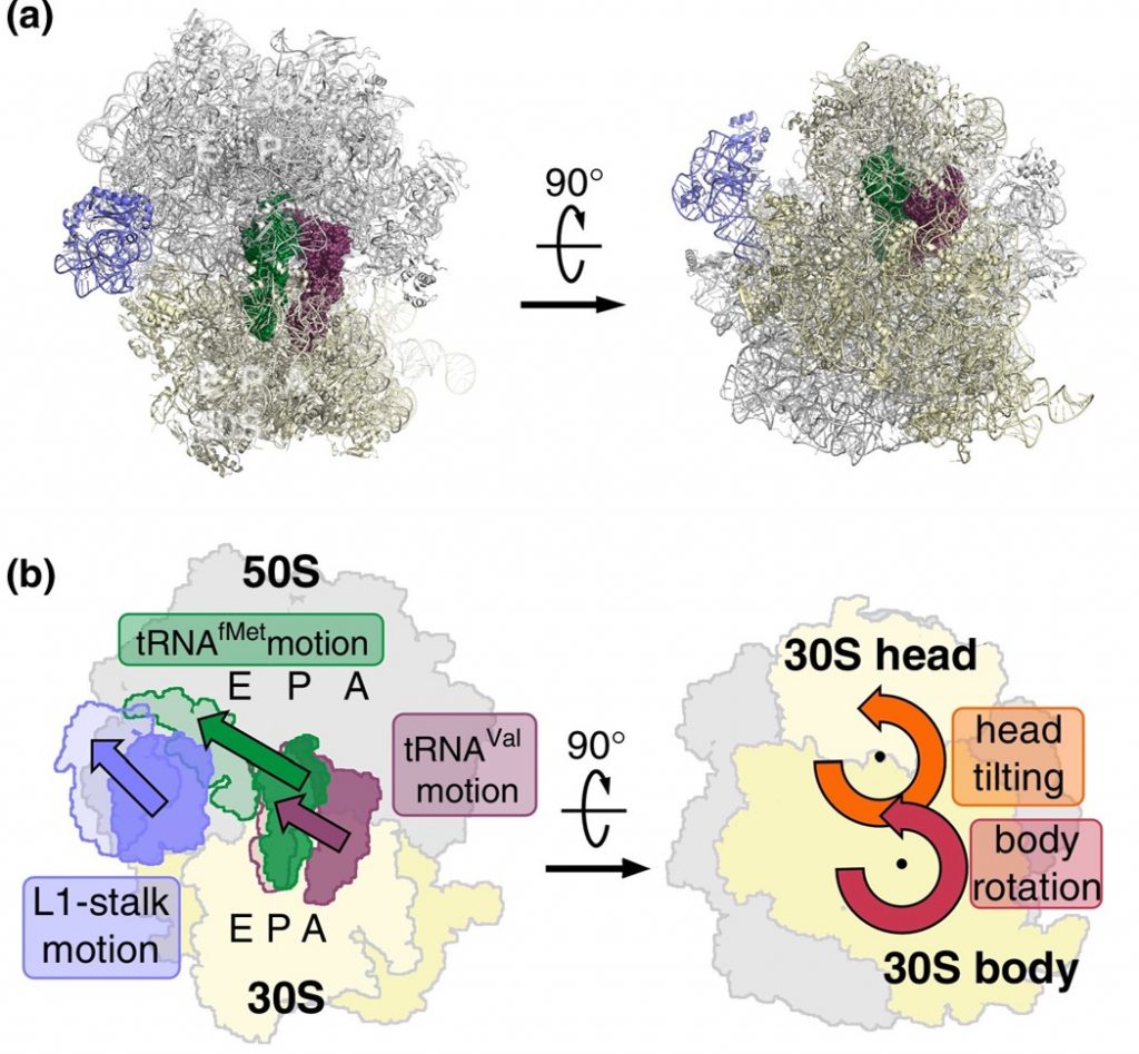 Figure 11.32 Large-scale Motion of the Large Subunit of the Ribosome During Translocation. (a) Pre-translocation structure of the ribosome with tRNAs in A and P sites (green, brown). The L1 stalk of the large subunit is shown in purple. (b) Motions accompanying tRNA translocation.