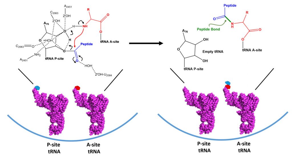 Figure 11.30 Proposed Mechanism of Peptide Bond Formation in the Ribosome. (Left) tRNA molecules docked in the P- and A-sites are oriented such that the two amino acids move in close proximity. Hydrogen bond formation with the ribosomal rRNA and surrounding water molecules stabilizes the formation of the transition state and enables the amine nigtrogen from the A-site amino acid to attack the carbonyl carbon of the P-site amino acid. Formation of the peptide bond occurs prior to the C-O bond breakage forming a transient oxyanion intermediate. (Right) The products of the peptidyl transferase reaction include the nascent growing peptide attached to the A-site tRNA and an empty tRNA in the P-site.