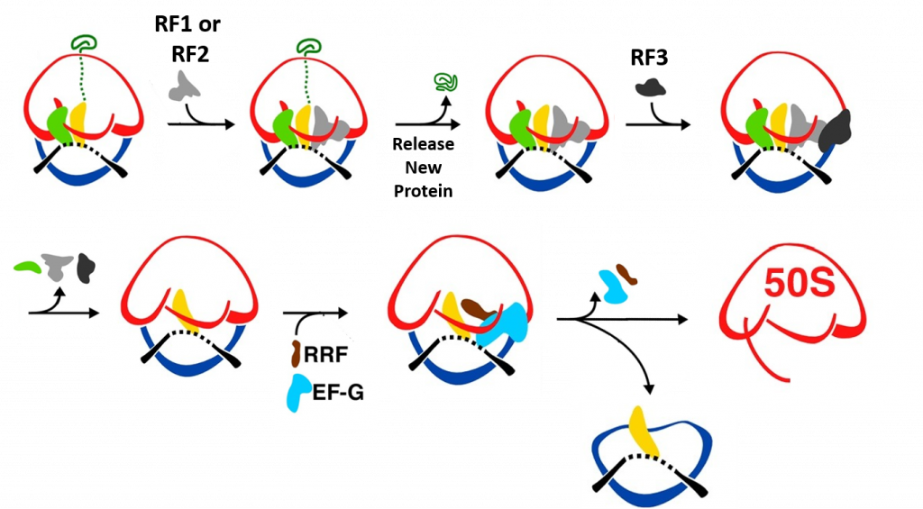 Figure 11.35 Termination of Translation. When a stop codon enters the A-site of the ribosome RF1 or RF2 enter the A-site and bind with the mRNA. This leads to the hydrolysis of the protein and release through the exit tunnel. Binding of RF3 and GTP hydrolysis causes the dissociation of the RF factors and conformational change of the ribosome structure. Subsequent binding of the ribosome recyclying factor, RRF, and EF-G causes the dissociation of the large and small ribosomal subunits and the release of the mRNA.