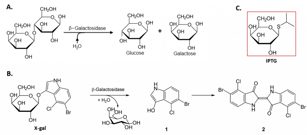 Figure 13.4 Reactions Controlled by the Expression of the Lac Operon. (A) Expression of the β-galactosidase enzyme enables the breakdown of lactose into the simple sugars, glucose and galactose for E. coli to use as a food resource. (B) The β-galactosidase enzyme also mediates the breakdown of the non-native substrate 5-bromo-4-chloro-3-indolyl-β-D-galactopyranoside (Xgal). Breakdown product (1) 5-bromo-4-chloro-3-hydroxyindole quickly dimerizes into the intensely blue product (2) 5,5′-dibromo-4,4′-dichloro-indigo making it a useful tool for molecular biology. (C) β-D-1-thiogalactopyranoside (IPTG) can serve as a non-native inducer of the lac operon. It mimics the structure of lactose and binds with the Lac Repressor.