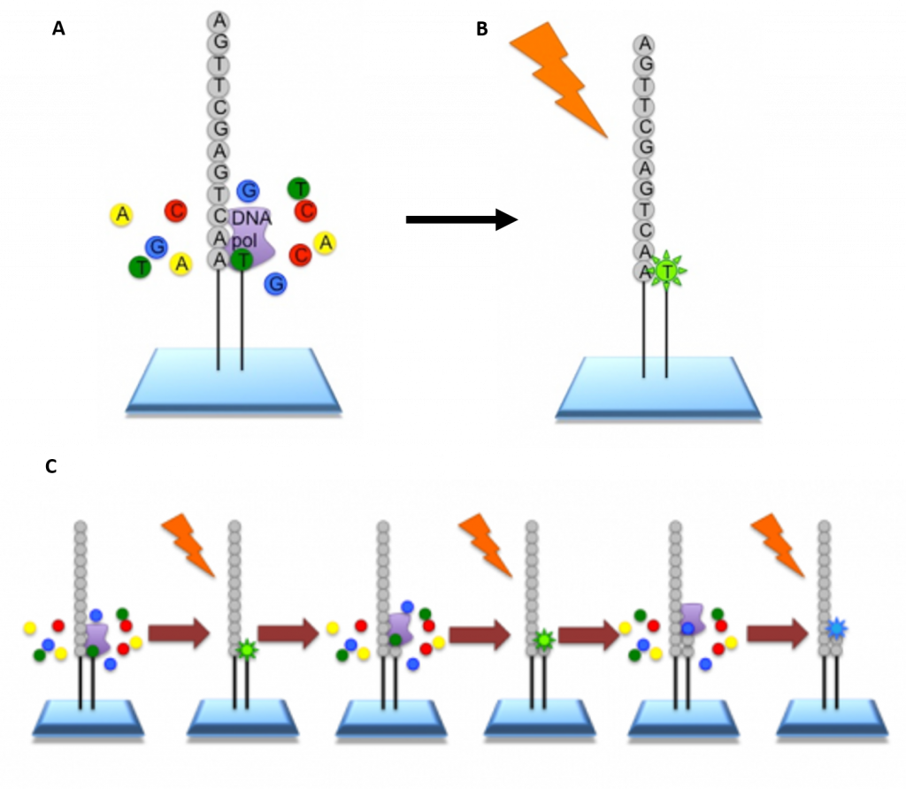 Figure 5.9 Procedure for Illumina Sequencing. (A) The slide with PCR amplified fragments of DNA is flooded with nucleotides and DNA polymerase. These nucleotides are fluorescently labelled with each color corresponding to a specific base. The reactions also have a terminator present, so that only one base is added at a time. (B) An image is taken of the slide. In each reaction location, there will be a fluorescent signal indicating that a specific base that has been added. (C) The data is recorded and the slide is then prepared for the next cycle. In preparation, the terminators are removed, which will allow the next base to be added, and the fluorescent signal is cleaved, preventing the fluorescent signal from contaminating the next image. The process is repeated, adding one nucleotide at a time (G, A, T, or C) and imaging in between. All of the sequence reads will be the same length as single bases are added at each cycle.