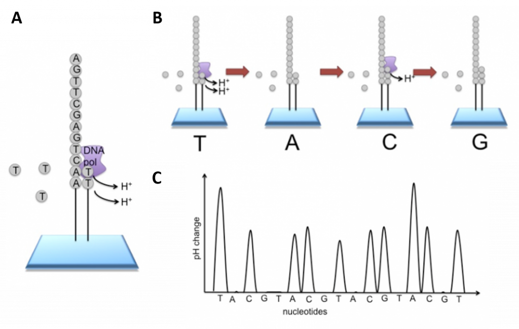 Figure 5.11 Ion Torrent Sequencing Technology. (A) Similar to 454 sequencing, the slide is flooded with a single species of dNTP, along with buffers and polymerase. The pH is monitored in each of the wells after the addition of the specific dNTP. The pH will decrease when the dNTP is incorporated into the polymer causing the release of a proton (H+). The changes in pH allow us to determine if that base and how many thereof, were added to the sequence read. (B) The dNTPs are washed away and the process is repeated cycling through the different dNTP species. (C) The pH change, if any, is used to determine how many bases (if any) were added with each cycle.