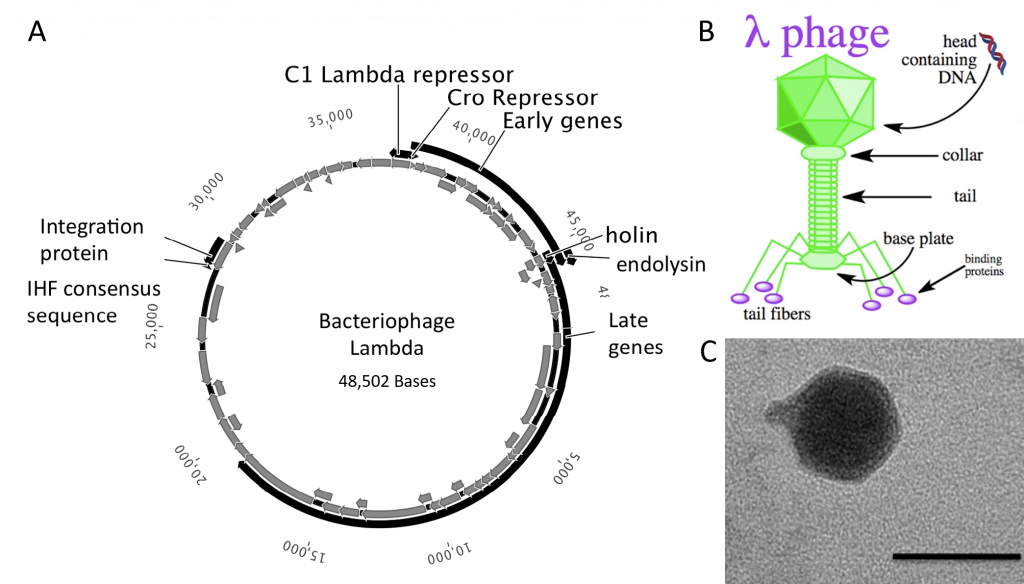 Figure 5.20 Lambda Phage. (A) Schematic representation of the circular genome of the lambda phage (B) Diagram of the Lambda Phage infectious particle and (C) Electron micrograph of the related bacteriophage, vibriophage VvAWI. The bar denotes 50 nm in length.