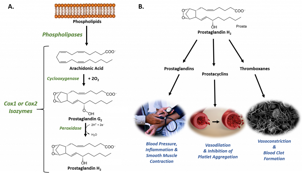 Figure 8.1 The Role of COX-1 and COX-2 in Prostaglandin Biosynthesis. (A) COX-1 and COX-2 are bifunctional enzymes that mediate the cyclooxygenase and peroxidase reactions that convert Arachidonic Acid to Prostaglandin H2. (B) Some of the physiological effects that prostaglandins, prostacyclins, and thromboxanes have on biological processes.