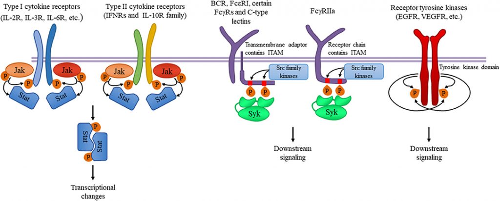 Figure 8.6. Tyrosine kinases and their signaling pathways. Type I and type II cytokine receptors utilize Janus kinases for the initiation of downstream signaling involved in the inflammatory responses. Src-family kinases and Syk are involved in several immune cell signaling pathways like immunoreceptor, integrin and C-type lectin signaling. Upon ligand binding, activation of Src-family kinases leads to the phosphorylation of tyrosine residues in immunoreceptor tyrosine-based activation motifs (ITAMs), that can be part of a transmembrane adaptor molecule like in case of B cell receptor (BCR), FcεRI, and certain FcγRs and C-type lectins, or of the receptor chain itself like in FcγRIIa in humans. Syk is recruited to the dually phosphorylated ITAMs and becomes activated resulting in the recruitment and activation of various further adapter proteins promoting downstream signaling. Receptor tyrosine kinases, for example EGFR and VEGFR have intrinsic tyrosine kinase activity leading to auto-and transphosphorylation of the receptor chains upon ligand binding. Recruitment of several adaptors and effector molecules through SH2 and phosphotyrosine binding domains mediate downstream signaling.