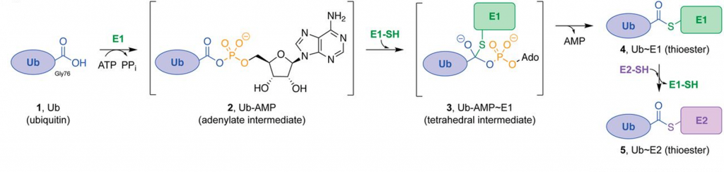 Figure 8.17 Enzymatic Activity of the E1 Ubiquitin Activating Enzyme. Ub E1s catalyze adenylation of the Ub C-terminal glycine-76 (1 → 2) using a molecule of ATP, thioesterification with an E1 catalytic cysteine ensues (2 → 3 → 4), and transthioesterification to an E2 catalytic cysteine (4 → 5) completes the reaction.
