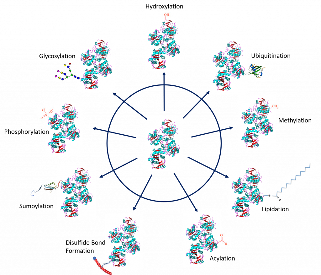 Protein PTMs involve the covalent addition of some chemical group by enzymatic catalysis. Typically, an electrophilic fragment of a co-substrate is added to an electron-rich protein side chain, which acts as a nucleophile in the transfer. Common covalent protein PTMs include phosphorylation, acylation, methylation, sumoylation, ubiquitination, glycosylation, lipidation, oxidation and disulfide bond formation (either internal within a single protein or linking two protein/peptide chains together). Examples of common PTMs are provided in Figure 8.5.