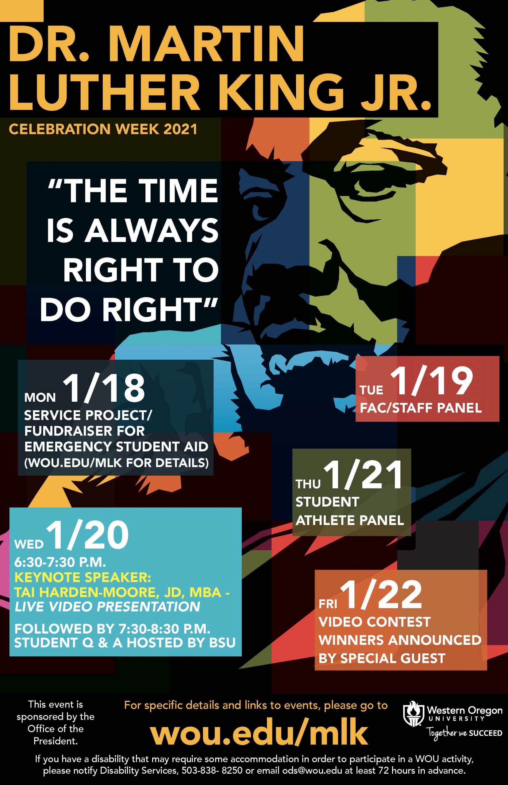 This year’s Dr. Martin Luther King Jr. Celebration theme is “Injustice Anywhere is A Threat to Justice Everywhere,” which is included in Dr. King’s response to criticism of his work and ideas, in his 1963 essay, “Letter from a Birmingham Jail.” This year’s celebration highlights WOU Black student excellence as well as an exploration of one of Dr. King’s most historic letter from a Birmingham jail. For event details, please reference below.