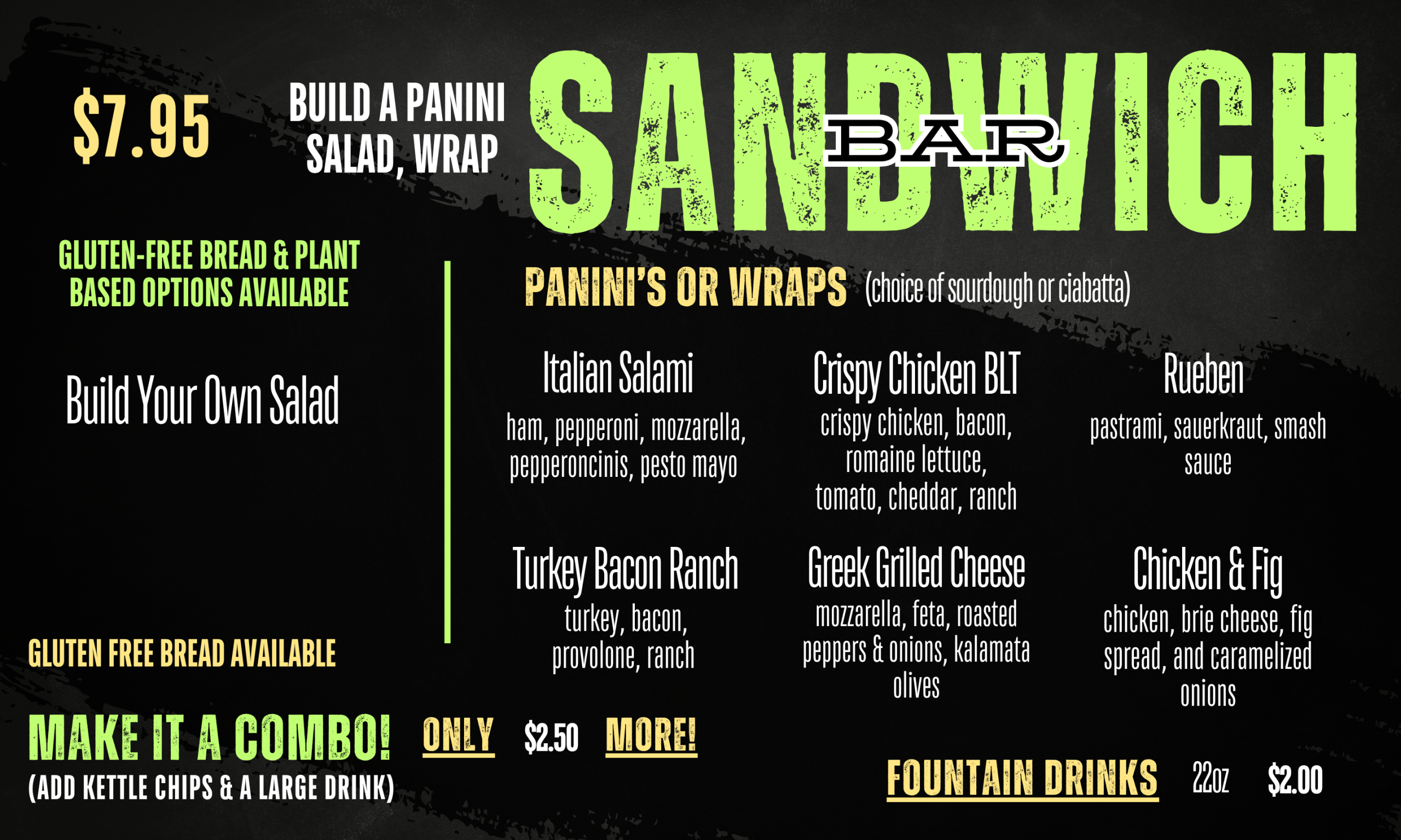 The Summit has a wide variety of options including smash burgers, smash fries, curly fries, chicken tenders, chicken sandwiches, or a grilled cheese! We also have a deli side that includes different types of paninis, wraps, and salads.